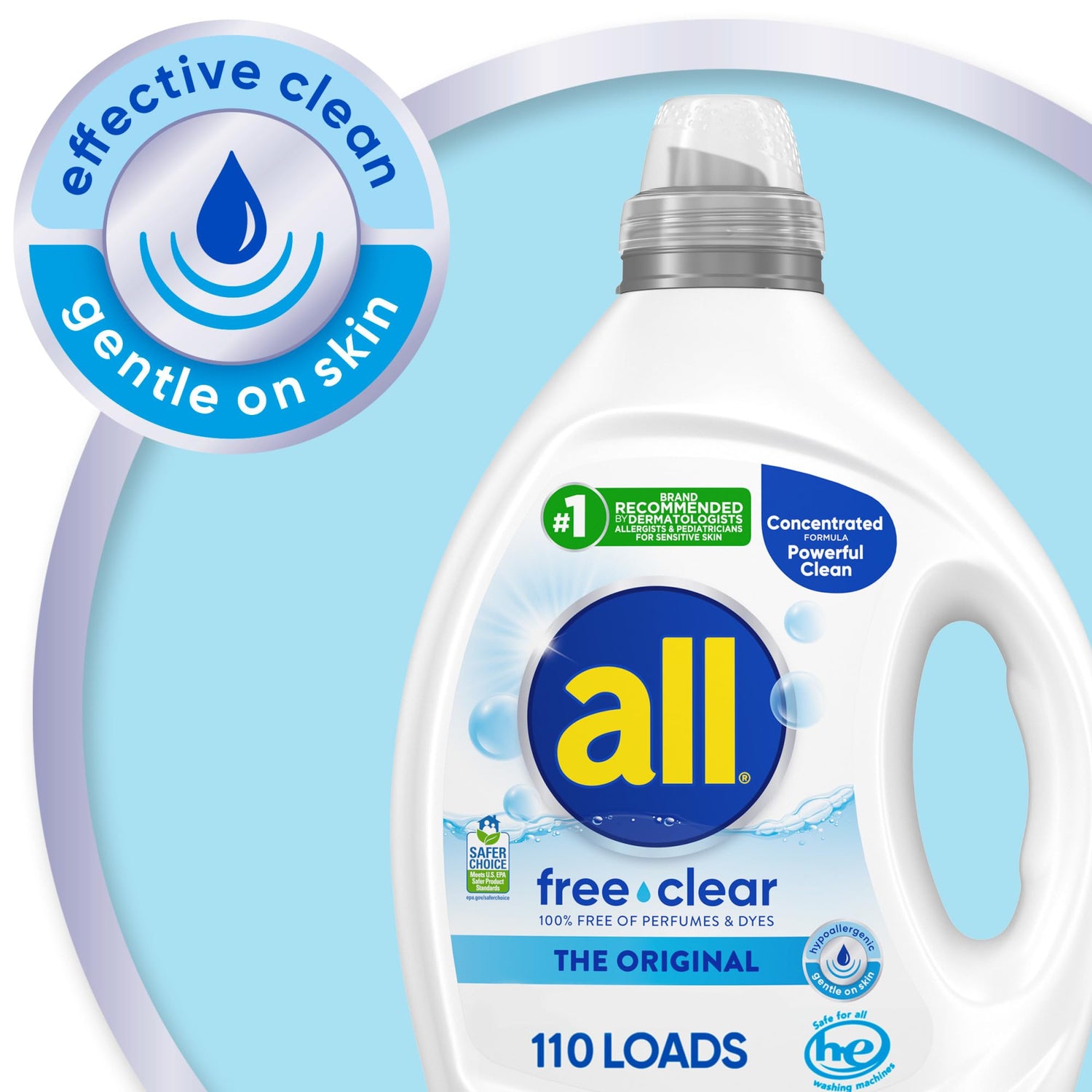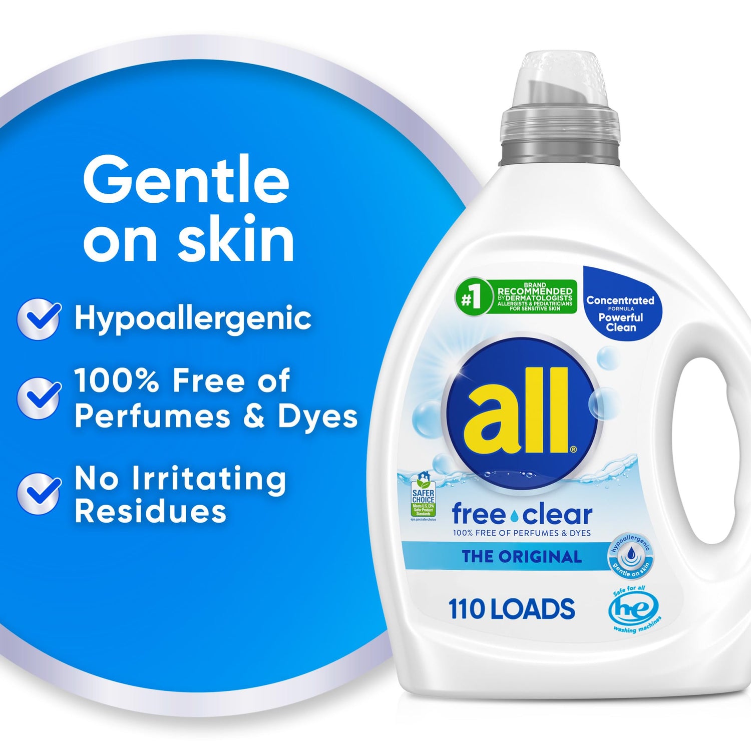 Details: all free clear is the #1 laundry detergent brand recommended by dermatologists, allergists and pediatricians for sensitive skin. It is 100% free of perfumes and dyes, hypoallergenic, and gentle on sensitive skin. This unscented, fragrance free liquid laundry detergent is safe to use in any washing machine including high efficiency (HE) and at any water temperature. all free clear is also available in a convenient MIGHTY PACS, single-dose pac format. Pair with all free clear fabric softener and dryer sheets for a complete sensitive-skin-friendly laundry routine. This package includes one 82.5oz bottle of all free clear liquid laundry detergent, enough for 94 loads. Packaging may vary.