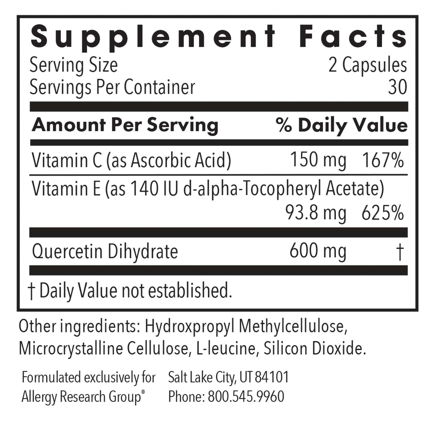 - ESSENTIAL MINERALS - Contains 150 mg of Vitamin C, 63 mg of Vitamin E & 300 mg of Quercetin into a vegetarian capsule free of wheat & gluten, dairy, eggs, soy, fish, peanuts, tree nuts, corn, & yeast*