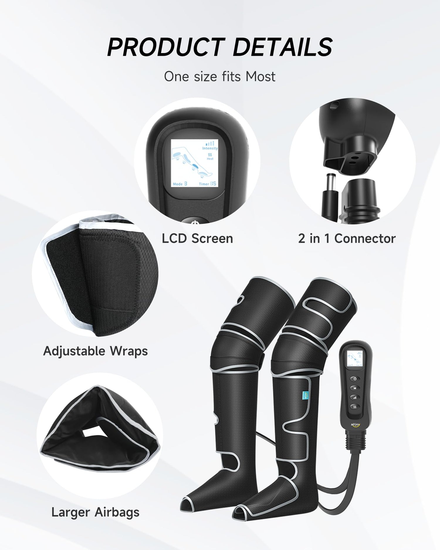 - AIR COMPRESSION FULL LEG MASSAGER GIFT: Looking for a thoughtful health gift?Look no further than this leg massager. Compression technology is scientifically known to promote blood circulation, helpful for vericose veins, muscle fatigue, cramps, swelling and edema. Boasting 5 compression modes and 4 intensities, along with 2 heat levels specifically for foot and knee. Plus with 4 extenders for universal fit, making it ideal for athletes, nurses, teachers, rehabilitation patients, enior citizens