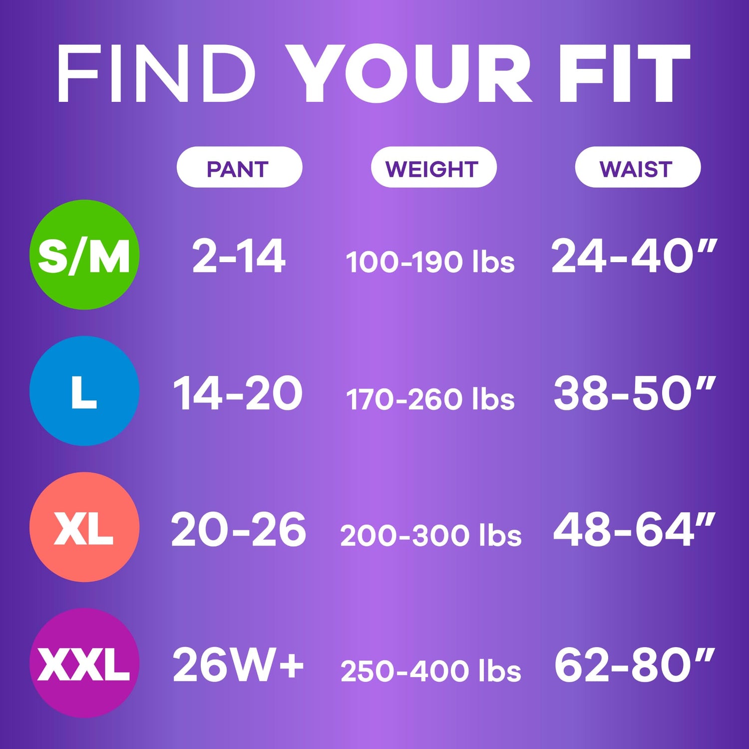 - DESIGNED TO FIT ALL KINDS OF CURVES from dress/pant sizes 2-26W+. Find your fit on the Always Discreet My Fit size chart