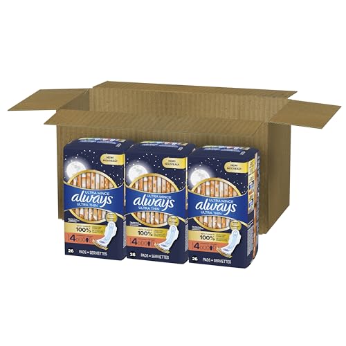 Always Ultra Thin Overnight Pads with Flexi-Wings, Size 4, Overnight, Unscented, 78 Count Total (3 Packs of 26)