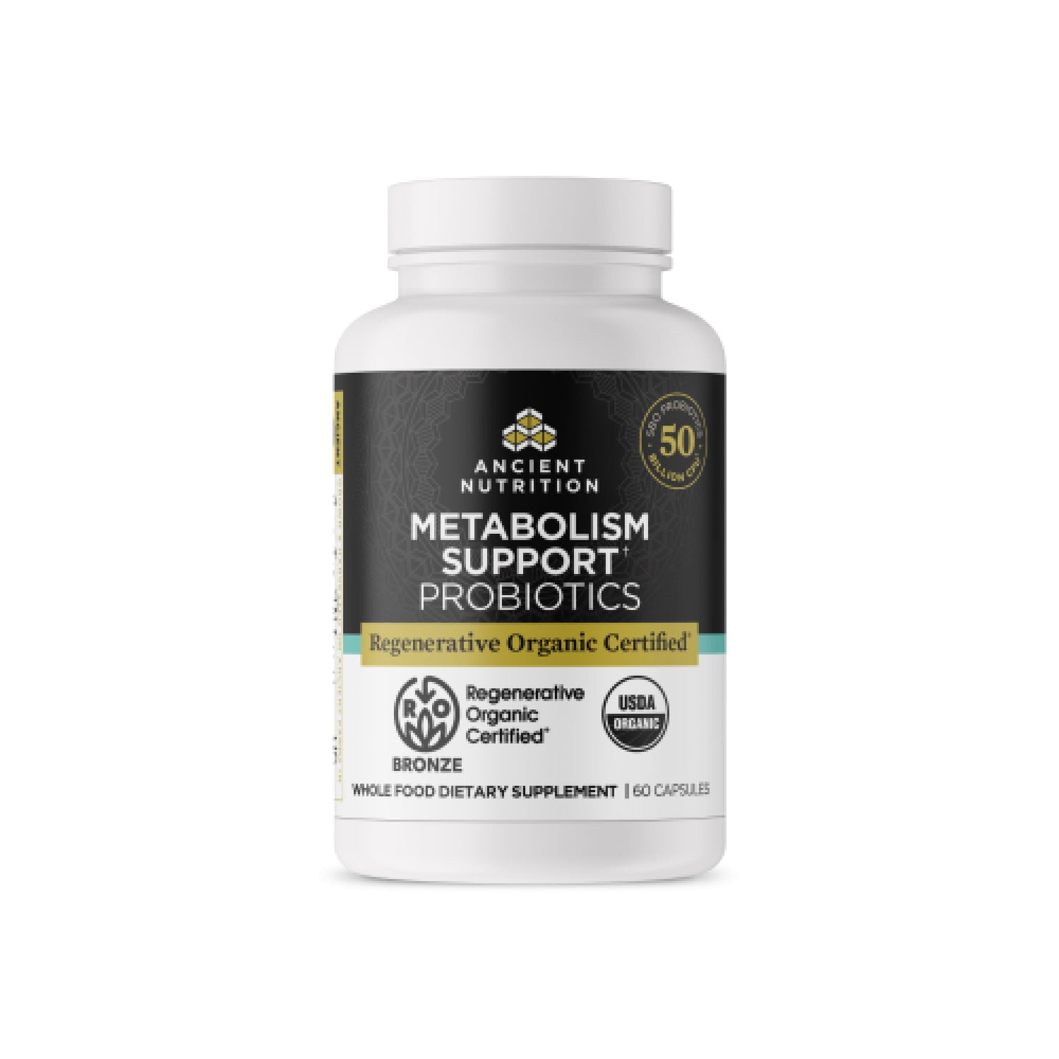 Ancient Nutrition Regenerative Organic Certified Probiotics for Metabolism Support, Healthy Digestion and Immune System Function Support, 50 Billion CFUs* Per Serving, 60 Count