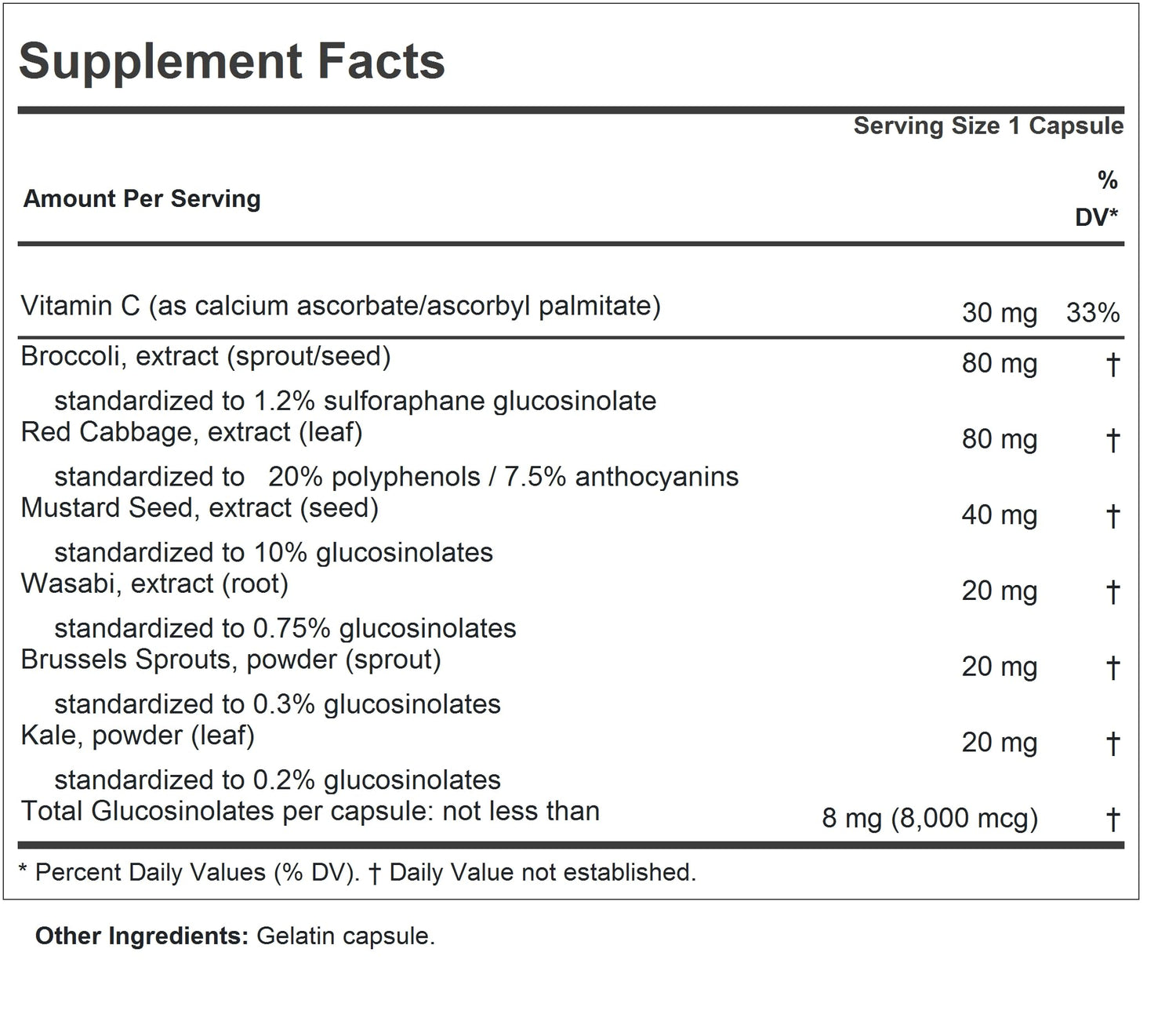 - Superior pure bio-active ingredients - Provides high levels of standardized extracts from a broad array of cruciferous vegetables, including broccoli, red cabbage, mustard seed, wasabi, brussels sprouts and kale. also: Vitamin C. Contains no Milk / Dairy-Free, Gluten-Free; no soy, yeast, wheat, sodium, salt, sugar, fat, cholesterol, color, preservative, common allergens or manufacturing additives.