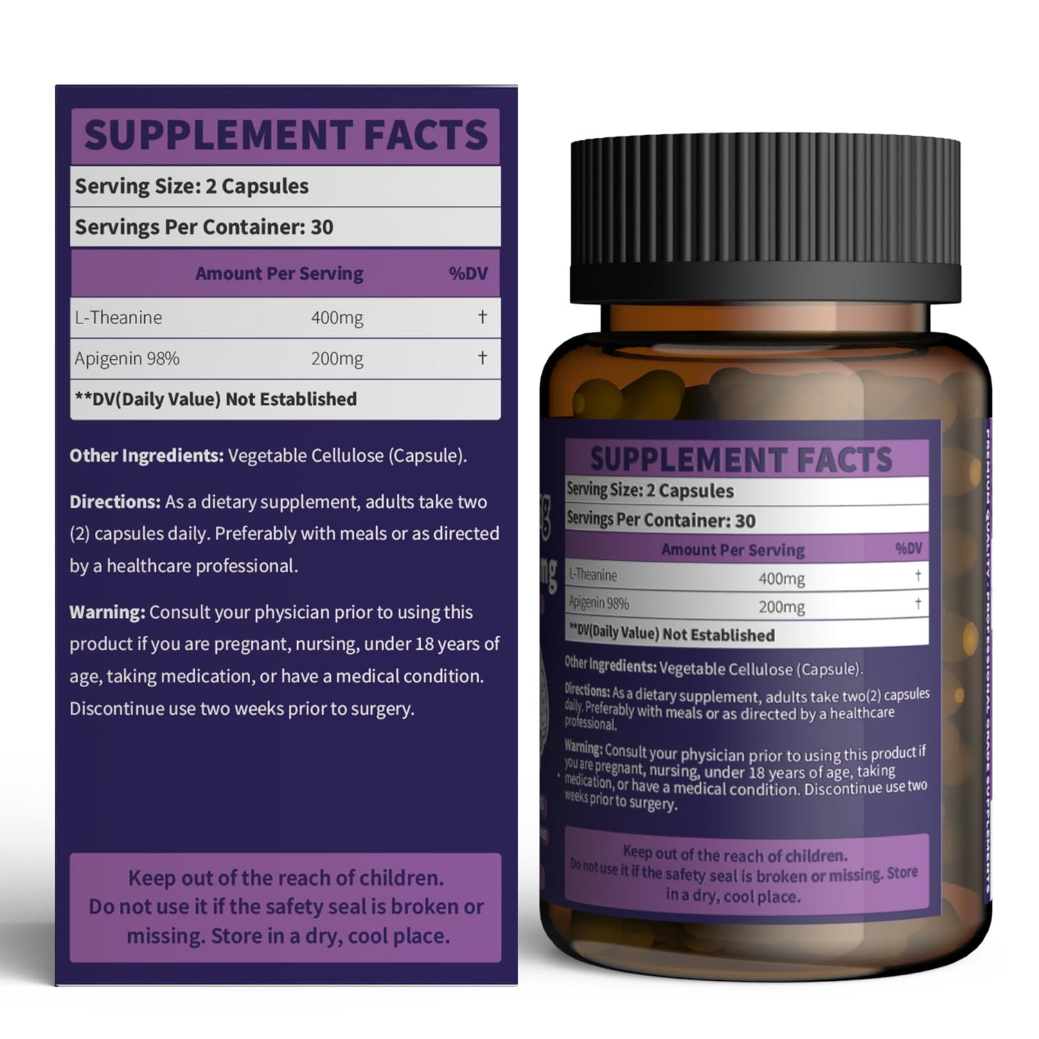 - ๐๐๐ญ๐ฎ๐ซ๐๐ฅ ๐๐๐ฅ๐๐ฑ๐๐ญ๐ข๐จ๐ง ๐๐ง๐ ๐๐ญ๐ซ๐๐ฌ๐ฌ ๐๐๐ฅ๐ข๐๐: Each serving contains 200mg of Apigenin and 400mg of L-Theanine. This potent combination effectively eases daily stress, helping you quickly regain calm and relaxation after a busy day. L-Theanine, an amino acid found in green tea, is known for promoting relaxation and enhancing focus, while Apigenin, a powerful flavonoid, helps regulate stress and promotes tranquility.