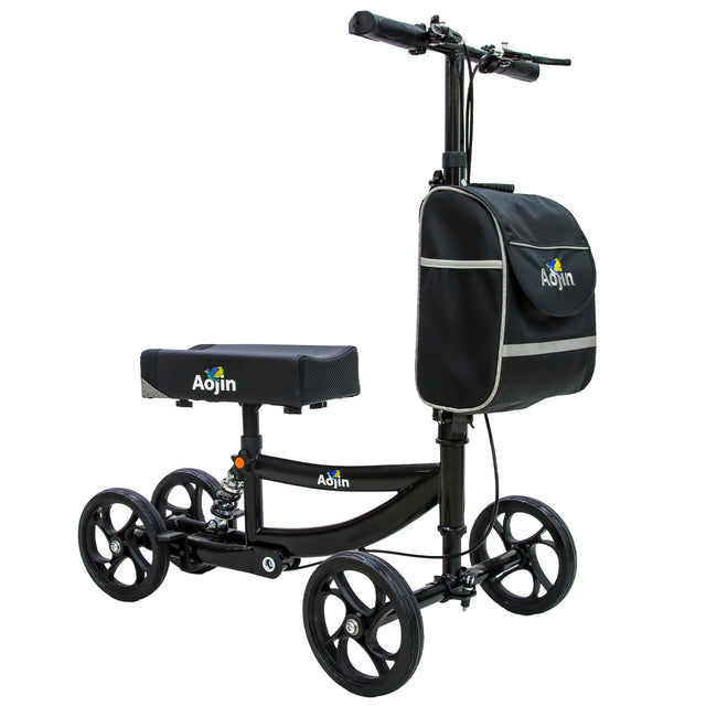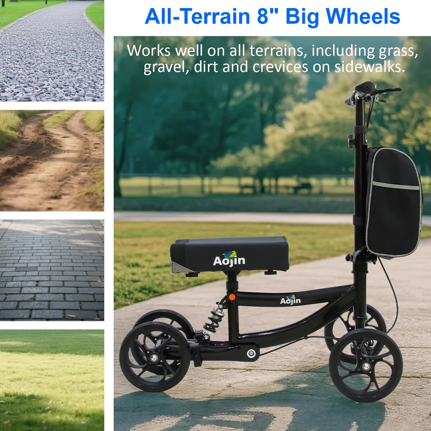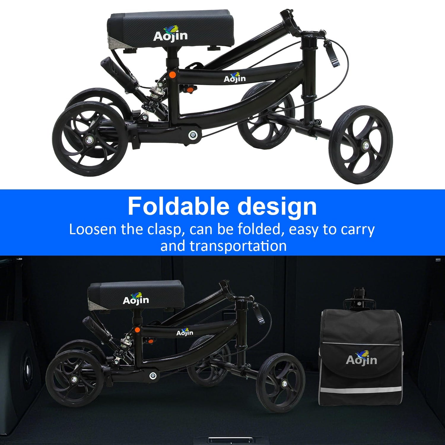 Aojin Knee Scooter, 300lbs Capacity, 13" Big PU Seat, All Terrain Foldable Knee Scooter Walker with Bag for Foot Injuries Compact Crutches Alternative (Black)