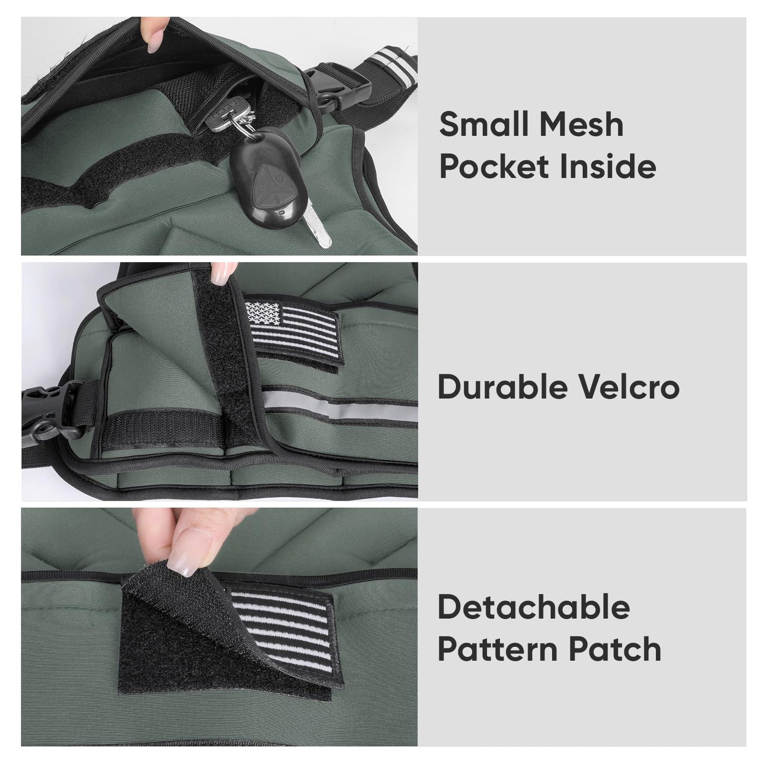 - [LARGE STORAGE POCKET] The weighted vest for men & women includes a spacious mesh pocket on the front, perfect for storing your essentials during workouts, such as your phone, keys, and wallet. Customize your vest with a detachable patch (3.2"x2.2") for added fun and motivation while exercising