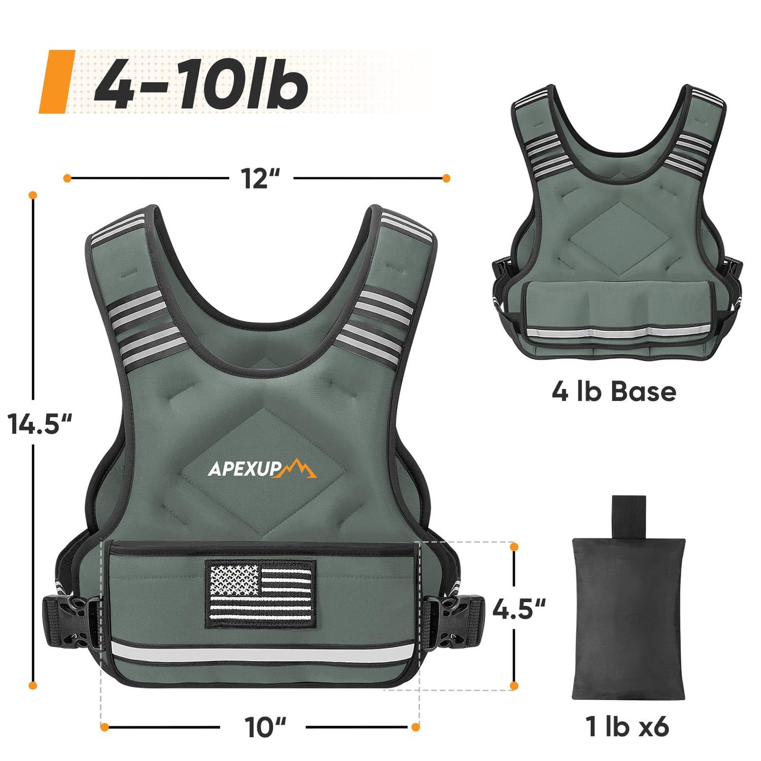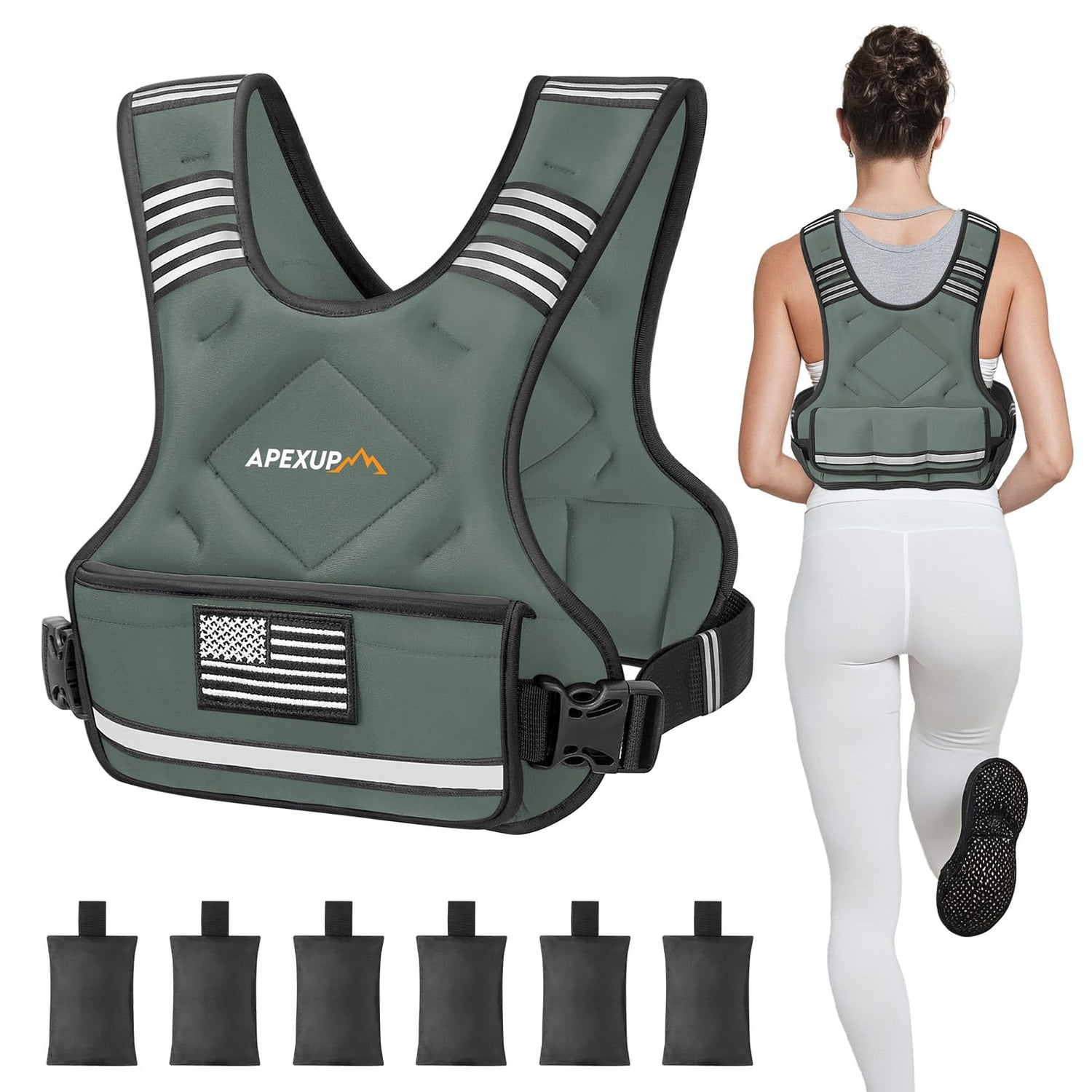 - [ADJUSTABLE WEIGHTED VEST] APEXUP adjustable weighted vest has a base self-weight and comes with 6 sandbags, allowing you to adjust the weight according to your needs and saving you the trouble of buying multiple vests. Choose from 3 weight ranges based on your training stage, 4-10 pounds, 12-18 pounds, and 20-32 pounds