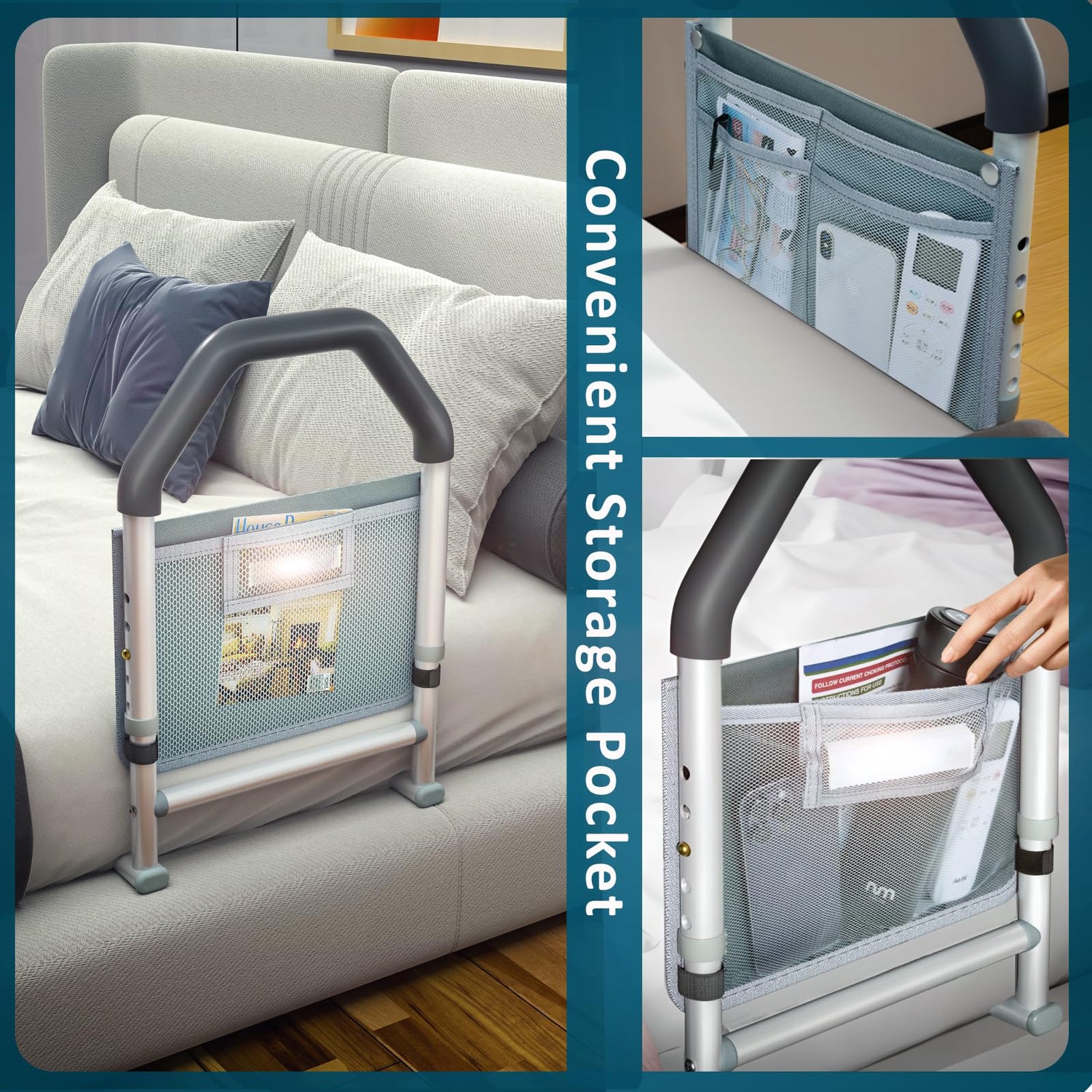- Convenient Storage: Bed assist rails come equipped with a versatile storage bag. This high-quality, lightweight, and pouch is designed to store essential items such as glasses, remote controls, medications, magazines, and more. It keeps items within easy reach, providing added bedside convenience.