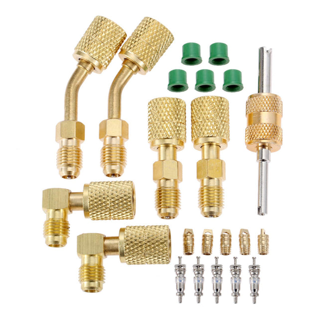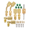 - ❄ WELL-DESIGN VALVE --- R410a adapter charging vacuum port adapters have thimble, in the course of the operation, it will not open the air conditioning core tube, completely solve the problem of fluoride leakage injury, security is guaranteed. The coupler nuts are deeply knurled for quick finger-tightening. With 45° 90° straight angle on the service port site for easier access.