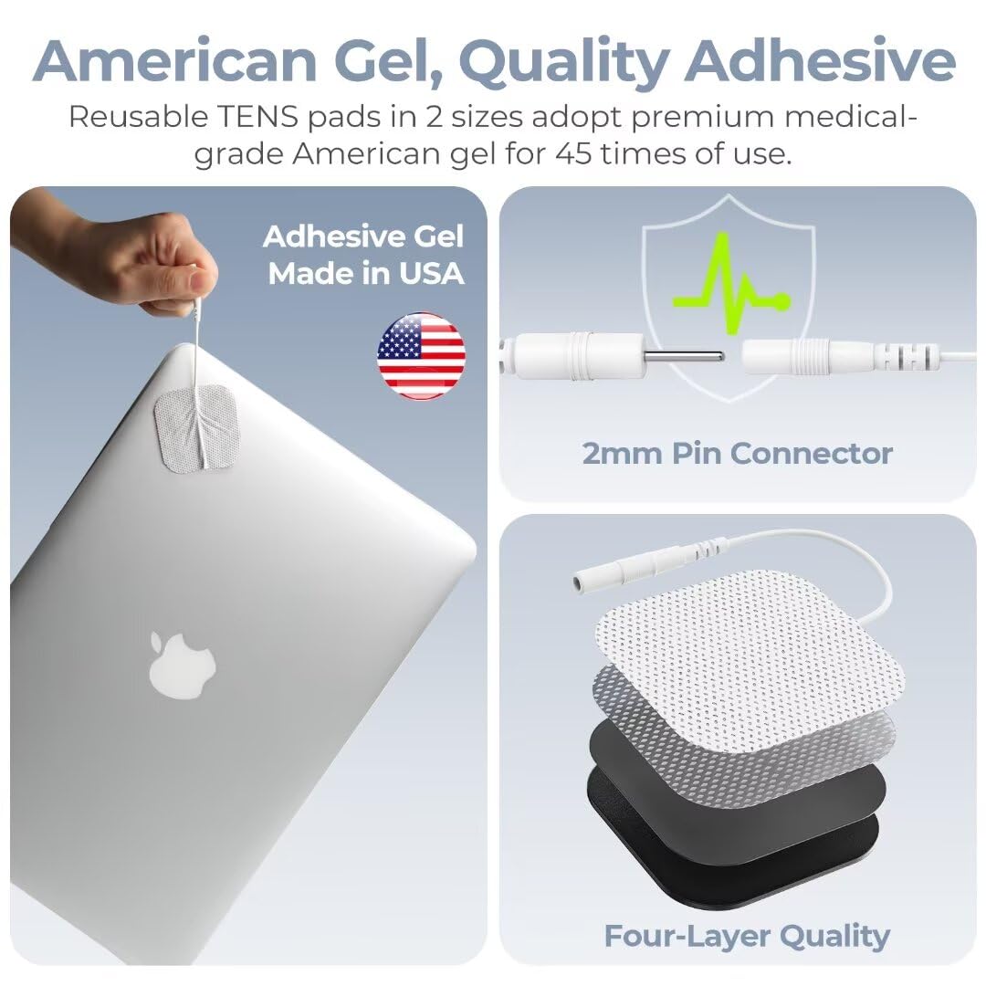 - 4 Outputs with 8 TENS Pads: If you want efficient pain relief therapy for 4 body parts at the same time or enjoy relief with your lover, this TENS machine is the ideal choice. It features 4 outputs for multi-area treatment with up to 8 American Gel TENS pads. The electrode pads in 2 sizes can meet your specific relief needs. The 2" x 2" electrodes are ideal for shoulders or necks, and the larger 2" x 4" pads are suitable for large body areas like the back