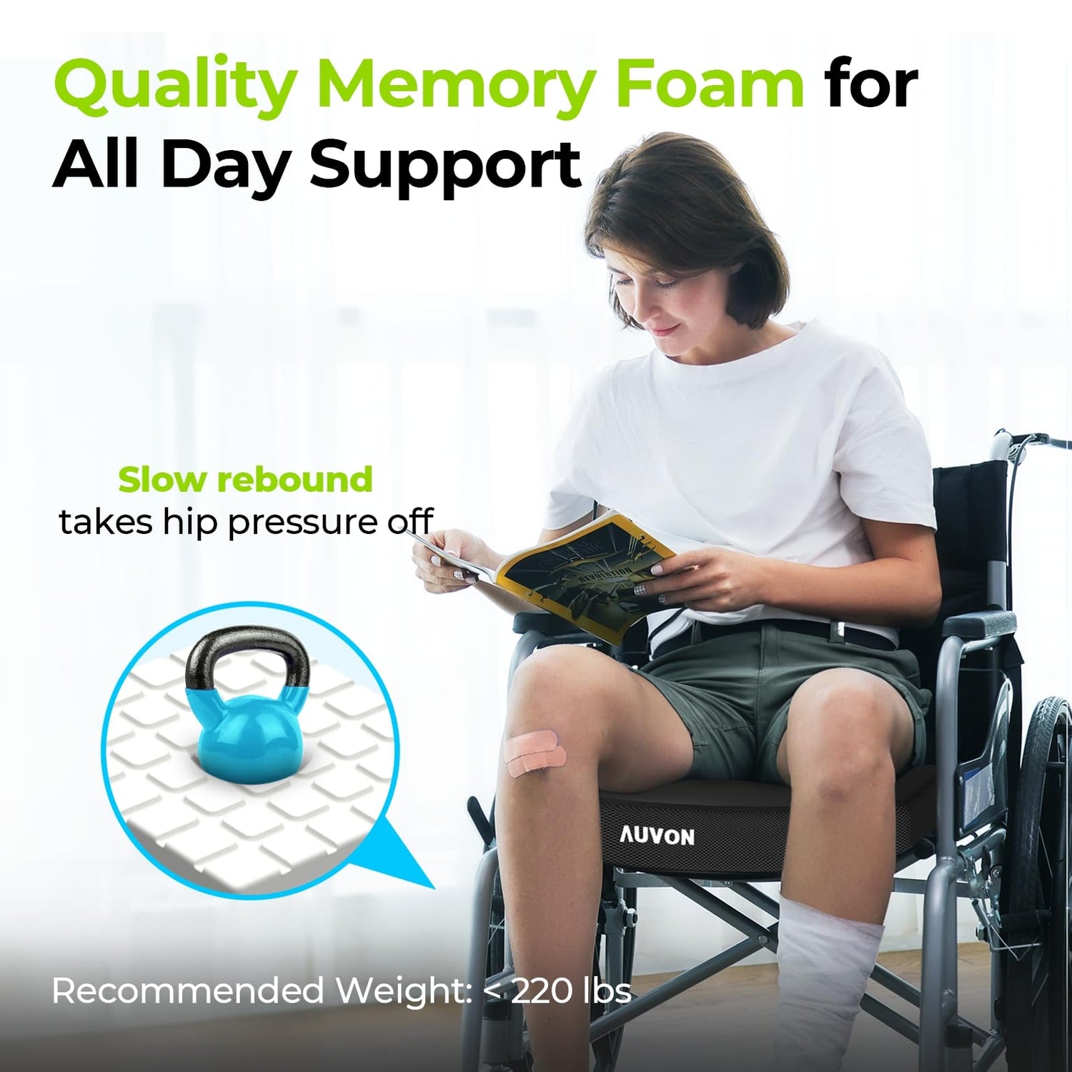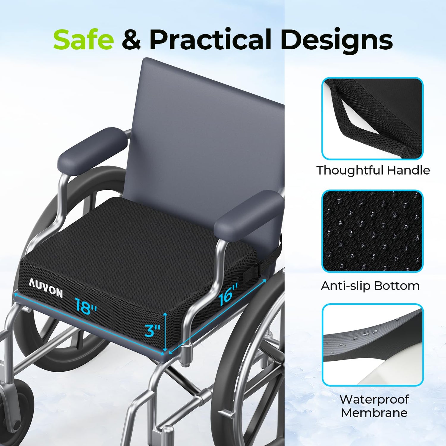AUVON Cooling Gel Wheelchair Seat Cushion for Sciatica, Back, Pressure Sore and Ulcer Pain Relief, Breathable Memory Foam Chair Cushion with Waterproof Silk Fabric, Removable Strap, Anti-Slip Cover