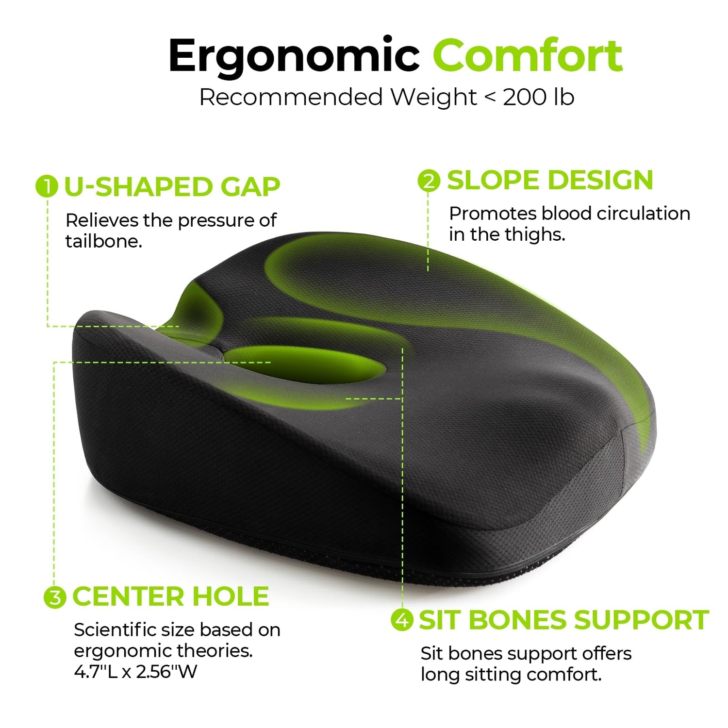 - Ergonomic Designs, Sitting Comfort: This donut pillow for tailbone pain is crafted with 3 ergonomic designs. The ergonomic U-shaped cutout helps reduce coccyx compression and sciatic nerve pressure. The inclined support zone conforms to the thighs for blood circulation. The contoured shape fits the pelvis for support and soothes soreness