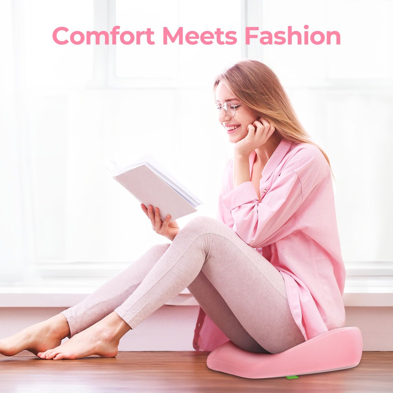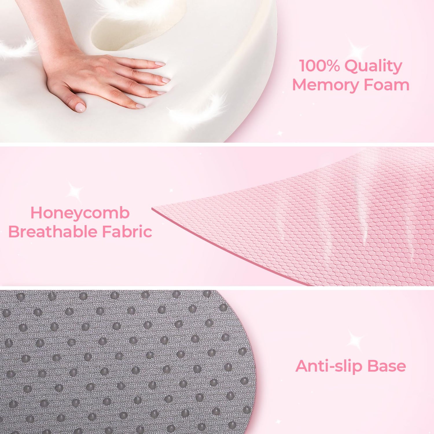 - Multiple Use for Daily Sitting Comfort. This pink donut pillow for hemorrhoids is designed in 17.2''L x 16.2''W x 3.1''H, which is suitable for various chairs, such as office chairs, car seats, dining room chairs. Thoughtfully crafted with an anti-slip bottom, this hemorrhoid pillow for sitting is stable on your chair, no more slipping or hassle adjustment.