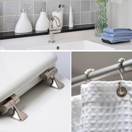 - DECORATIVE BRUSHED NICKEL HINGES: Stylish seat with a metal hinge in a modern brushed nickel finish that complements your bathroom décor or hardware beautifully; this seat adds practical functionality while elevating the look of your space