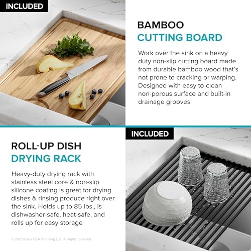 - SINK KIT INCLUDES: Stainless steel kitchen sink, heavy-duty bamboo cutting board, roll-up dish drying rack, protective bottom grid, drain assembly, and decorative drain cover