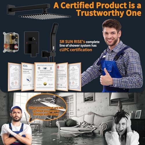 SR SUN RISE 12 Inches Matte Black Shower System 12 Inch Brass Bathroom Luxury Rain Mixer Shower Combo Set Wall Mounted Rainfall Shower Head System Shower Faucet Rough-in Valve Body and Trim Included