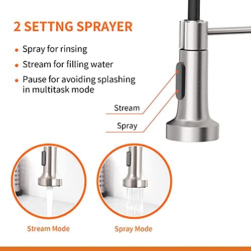 - DUAL MODE SETTING - Your kitchen faucets with pull down sprayer provides soft aerated stream and splash-free powerful spray due to its hard rubber sprayer holes. 360 degree kitchen sink faucets sprayer, the switch can be placed in every position as you like.
