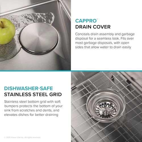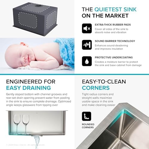 - HEAVY-DUTY 16 GAUGE STEEL: Constructed from proprietary KRAUS TRU16 – an extra-thick real 16-gauge stainless steel – for superior durability and resistance to dents and damage; WEAR-RESISTANT COMMERCIAL FINISH will not rust or dull from daily use, is easy to clean – SUPERIOR SOUNDPROOFING: Ultra-quiet NoiseDefend technology with extra-thick super silencer pads eliminates noise and vibration
