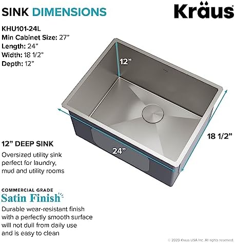 Kraus KHU101-24L Standart PRO 24-inch Undermount 16 Gauge Single Bowl Laundry and Utility Sink, 24 Inch, Tight Radius