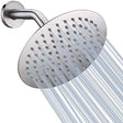 - STYLISH, NICE LOOK, High Quality SHOWER HEAD-Most showers on Amazon which are cheap chrome plated plastic. NearMoon 8 inches wide designer rain shower is 100% heavy duty solid stainless steel. The surface Brushed Nickel finish makes the showerhead beautiful and awesome match with any bathroom decor.