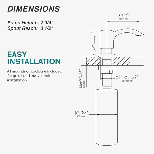 - NOTE: This soap dispenser is designed to fit sink holes with a diameter between 1 and 1.5 inches. The sink thickness should not exceed 2.17 inches (2 3/16”). Please check your installation conditions before purchase!