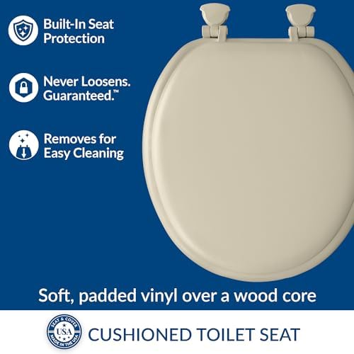 Mayfair Padded Toilet Seat, Cushioned Soft Vinyl over Wood Core Seat, Secure Hinges, Easy Clean, Round, Bone