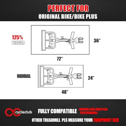 - |FULLY COMPATIBLE WITH PELOTREADMILL&BIKE| - The Cycleclub bike mat is made of soft PVC and designed specifically for spin bikes and treadmill(pls measure equipment size). Size of 36" x 72", it is 125% larger than the 24" x 48" mat. Perfect for most spin bike, treadmill & elliptical. But we still suggest measuring the dimensions of your equipment before making a purchase.And it is also a great choice for bike trainers, recumbent,ellipticals, rowers, steppers, upright and stationary bikes.