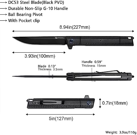 - 【Durable Blade and Handle】: DC53 Steel Black PVD Blade is corrosion resistant and easy to sharpen. Textured G-10 Handle provides excellent grip. This is the ideal option for an everyday carry knife that will stay strong through all your adventures.