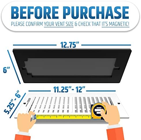 - CONFIRM YOUR VENT SIZE & MAGNETISM: Each cover is designed for specific vent sizes with tailored pockets and magnets. First, ensure your vent is magnetic. Second, this cover works on vents with widths between 5.25”-6” and lengths between 11.25”-12”.