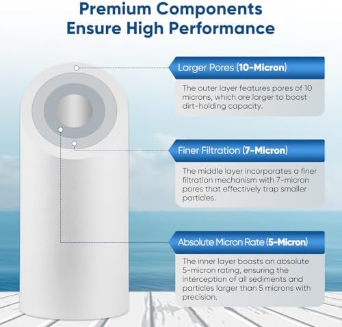 - ❄️【Multi-Layer Density Tech】- This whole house water filter is designed with a density of three PP layers to remove most particles and sediments. The inner layer is an absolute 5 microns, the middle layer is a nominal 7 microns, while the outer layer is a nominal 10 microns. The multi-layer density tech can capture impurities targeted and have 30% longer service life than the other common type.