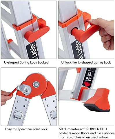- SAFETY MULTI POSITION LADDER: this folding ladder can be easily converted into an a frame ladder, stairs ladder ,extension ladder, can be quickly configured to many different shapes to meet different height requirements and work scene needs, make household chore such as repairing roofs , home appliance maintenance, window cleaning, warehouse job, tree trimming and so on become safer and easier