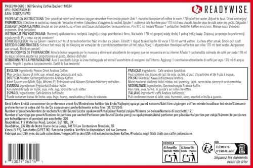 READYWISE - Freeze-dried Coffee Bucket, 360 Servings, Emergency, Meal & Drink Supply, Freeze Dried Survival Drink for Hiking, Adventure and Camping Essentials, Resealable Pouches