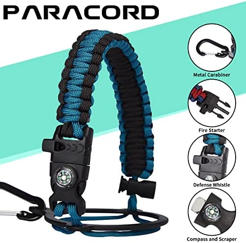 - UNIQUE DESIGNS PARACORD HANDLE: Full-function paracord handle made in individual styles to match the color of the flask water bottles. With compass, safety ring, carabiner, flint fire starter & whistle. It unravels into a sturdy and taut rope in an emergency, making the large water jug an ideal survival kit for expeditions in the wild