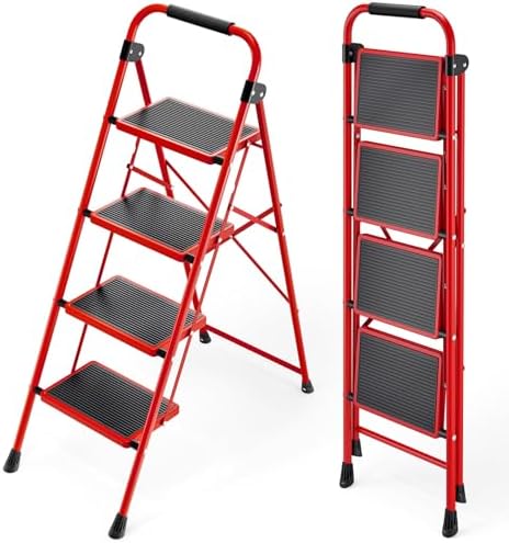 KINGRACK Step Ladder, Folding Ladder with Non-Slip and Wide Pedal, Small Ladders with Handle, Heavy Duty Steel Ladder, Lightweight Step Ladder (Red, 4 Step Ladder)