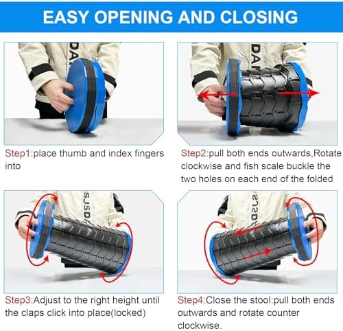 - 【Easy To Open And Use】The interior of this portable collapsible stool is designed with stiffeners to hold it in place, making the stool stronger and easier to open and close. The top and bottom of the collapsible stool are designed with two holes, you just need to hold the two holes, stretch and turn them clockwise/counterclockwise, and you can easily open and close them.
