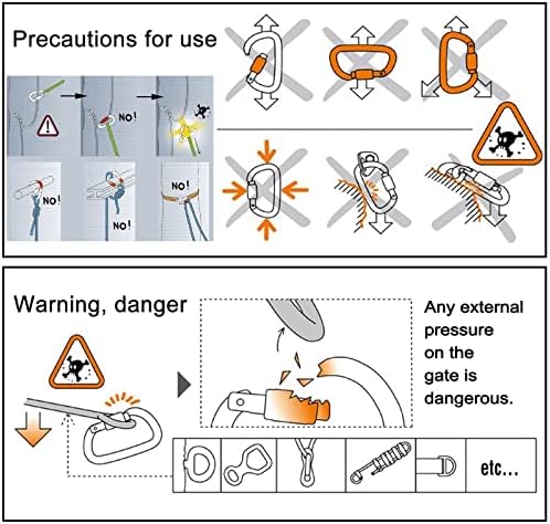 - 【Wide range of uses】This climbing carabiner has a weight limit at 25kN (5620 lbs) for major axis, 7kN cross force, and 7kN from end to end while the gate is open.These aircraft grade aluminum climbing carabiners are great for all activities like rock climbing, ice climbing, rappelling, rescue, swing, aerial yoga, camping and hiking etc.