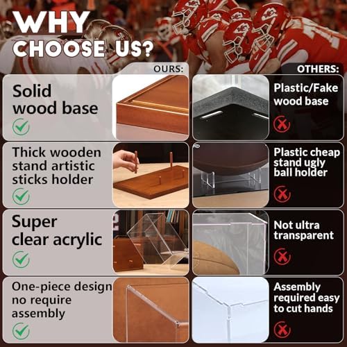 - Premium Quality - Crafted from high-quality materials, features a thick acrylic cover that keeps your football dust-free and protected from harmful UV rays that can cause fading. The ultra-clear acrylic cover allows for a clear and unobstructed view of the ball, while the acacia wood base provides a sturdy and stable platform, making it the perfect solution for showcasing your prized football memorabilia.