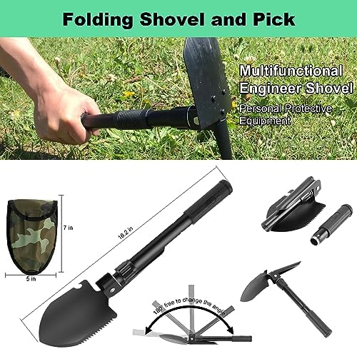 - 【High-Grade Survival Gear for Any Emergency】This is a professional emergency kit that ensure you will be well-prepared under any emergencies, it contains various practical survival tools: 15 in 1 hatchet, folding shovel and pick, compass, tactical flashlight, survival bracelet, tactical pen, multifunctional card, 8 in 1 spoon and fork, fire stone & scraper, bottle hanging buckle, hooks, glow stick, wire saw. Perfect gifts for men women like camping hiking fishing, and other outdoor activities.