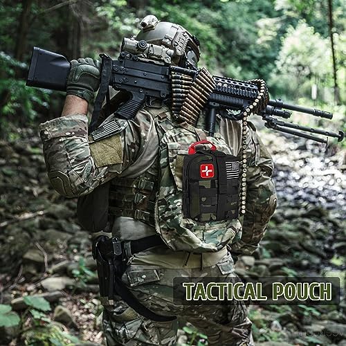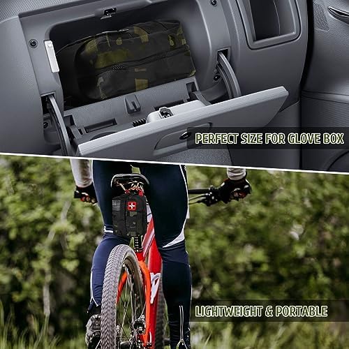 - 【Compatible and Portable】 The military grade MOLLE medical pouch is made of 1000D nylon, which is lightweight and waterproof. Inside the bag, there are three large compartments and several straps, all survival gear and equipment are stored in an organized and easy-to-find manner, making it easy to locate necessary items in an emergency situation. The MOLLE system on the back also allows you to easily attach the kit to your tactical vest, backpack, or belt.