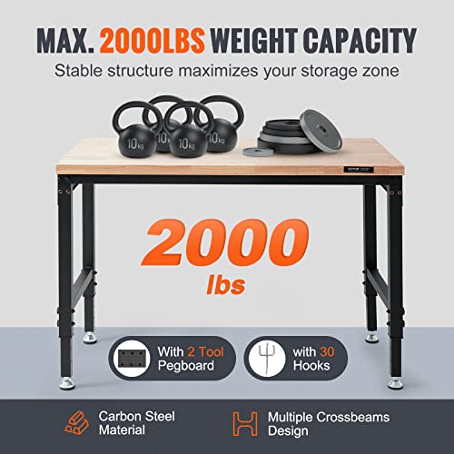 VEVOR Adjustable Workbench, 48" L X 24" W Garage Worktable with Universal Wheels, 28-39.5" Heights & 2000 LBS Load Capacity, with Power Outlets & Hardwood Top & Storage & Foot Pads, for Office Home