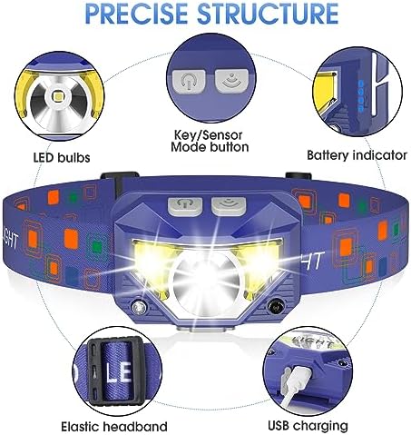 - Waterproof and 8 Modes: The headlight has IPX4 waterproof rate. The high-quality shell is more sealed and leak-proof, which is suitable for rain or snow, indoors or outdoors. The led headlamp has 8 lighting modes to meet your various needs. In key light mode, you can switch the main strong beam, main weak beam, side strong beam, side weak beam, red beam, SOS red strobe. In motion sensor mode, you can switch the main strong beam and side strong beam