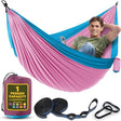 Durable Hammock 400 lb Capacity, Nylon Camping Hammock Chair - Double or Single Sizes w/Tree Straps and Attached Carry Bag - Portable for Travel/Backpacking/Beach/Backyard (Medium, Fuchsia & Sky Blue)