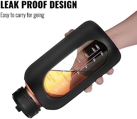 - GLASS WATER BOTTLE WITH SILICONE SLEEVE: The big water bottle for easy carry and use. The color of the silicone sleeve varies and stylish, provides impact protection, easy grip, no slips and reduced condensation. Enjoy the happy hour of drinking water