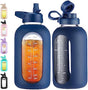 CIVAGO 64 oz Glass Water Bottle Jug with Straw and Handle, Half Gallon Sports Motivational Bottle with Time Marker and 2 Lids, Large Flask Canteen with Silicone Sleeve for Gym, Navy