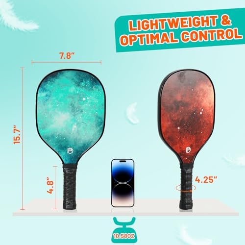 - 【Comfortable Ergonomic Grip】Our pickleball rackets are equipped with perforated cushioned grip that is sweat-absorbent, non-slip and shock absorbing. The ergonomic grip length of 4.8 inches not only provides you with great comfort, but also enables precise and stable shots, improving the level of your game.