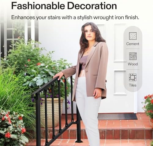 - Sturdy & Durable: Made of high-quality iron for stability and durability, this handrail withstands harsh outdoor conditions, including rain and snow; Thick black powder coating reduces chance of peeling off, rust, scratches, and discoloration, making the railing easy to maintain and clean