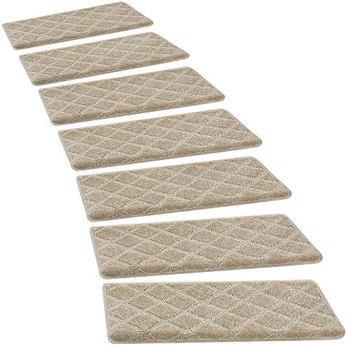 PURE ERA Bullnose Carpet Stair Treads Tape Free Non-Slip Indoor Stair Protectors Pet Friendly Stair Treads for Wooden Steps 9.5" x 30"(14 Pieces, Cream Gray Diamond Trellis)