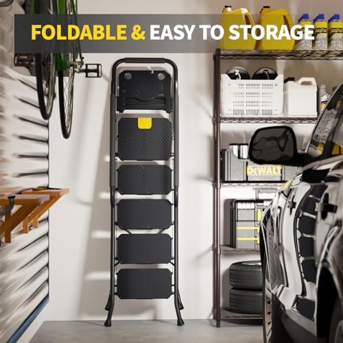 - Convenient Tool Platform: Foldable 5-step ladder comes with a practical tool tray, which can hold gloves, wrenches, paint buckets, light bulbs and other tools and equipment, rummaging through the tool tray, no need to climb up and down, improve efficiency and save energy, this ladder is your best working partner