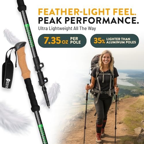 - Built to Last: Made of 100% Carbon Fiber, each pole weighs only 7.6 oz allowing you to keep your backpacking gear lightweight. Lighter & more versatile than aluminum, you’ll move quicker and exert less energy allowing you to walk longer distance.