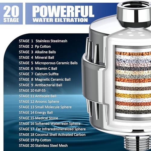 - [20-STAGE FILTRATION]-Shower filter includes KDF 55, alkaline ceramic ball, activated carbon, calcium sulfate and other 20-layer filter materials. It can effectively reduce impurities such as chlorine and heavy metals and remove odors. Ensure optimal water purification.
